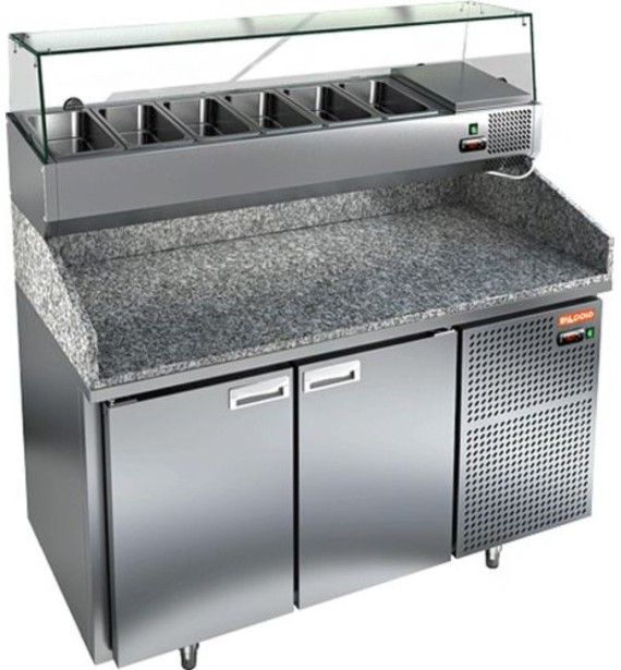 Стол охлаждаемый для пиццы HICOLD PZ3-11/GN сочетает в себе как глубокую рабочую поверхность из гранита, предназначенную для раскатывания теста, так и вместительную витрину для ингредиентов, рассчитанную под гастроёмкости GN1/3.