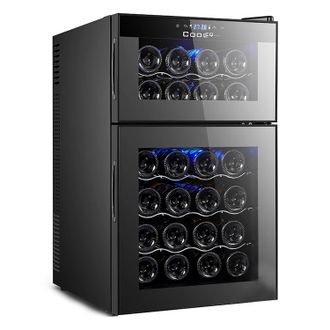 430х520х740мм; 220В, 0,115 кВт; 69л или 24 бутылки; Верхняя зона +8..+18, Нижняя зона +12...+18; Термоэлектрический; 2 раздельные зоны охлаждения; Макс. уровень шума 33 дБ; LED подсветка